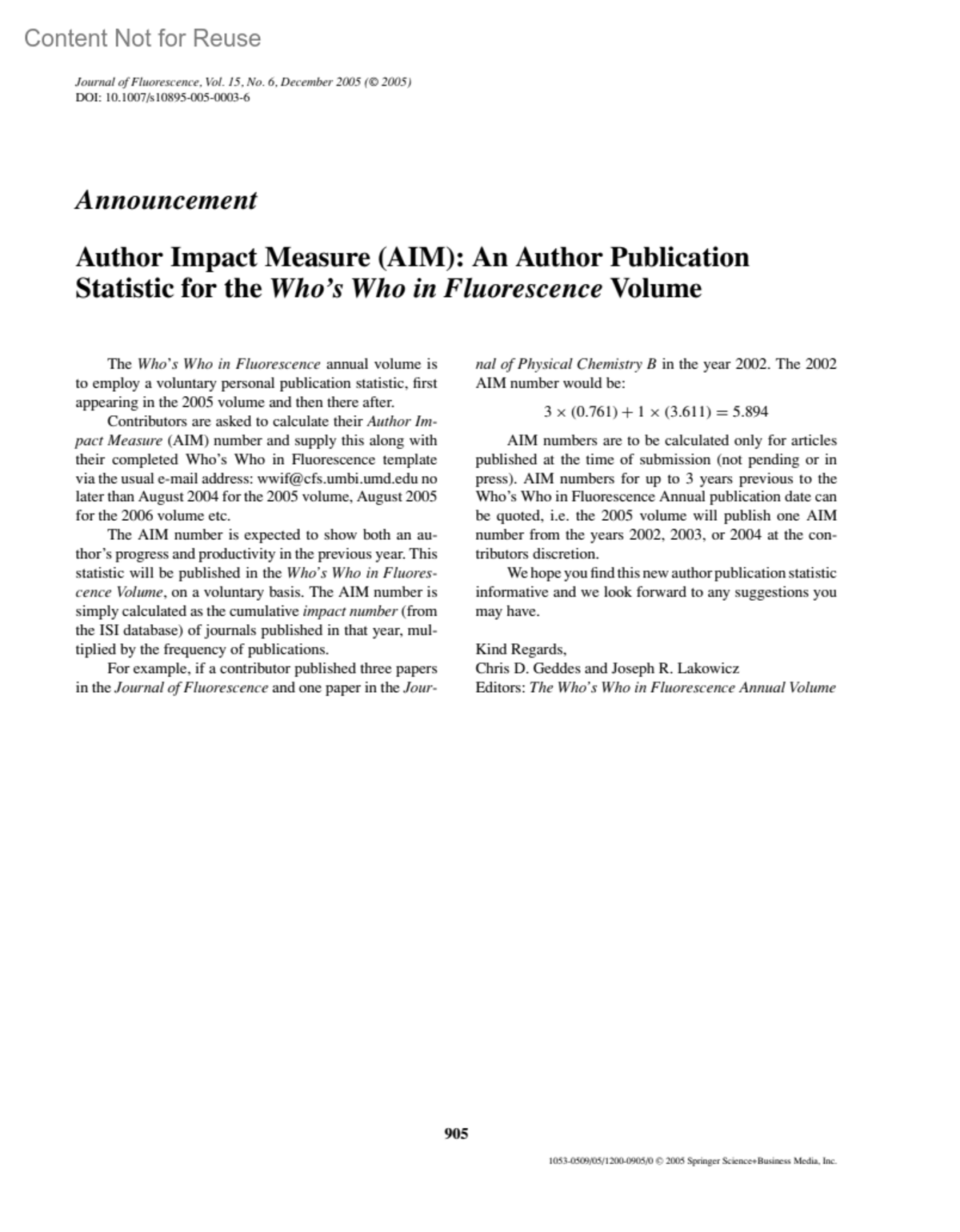 Author Impact Measure (AIM): An Author Publication Statistic for theWho's Who in FluorescenceVolume