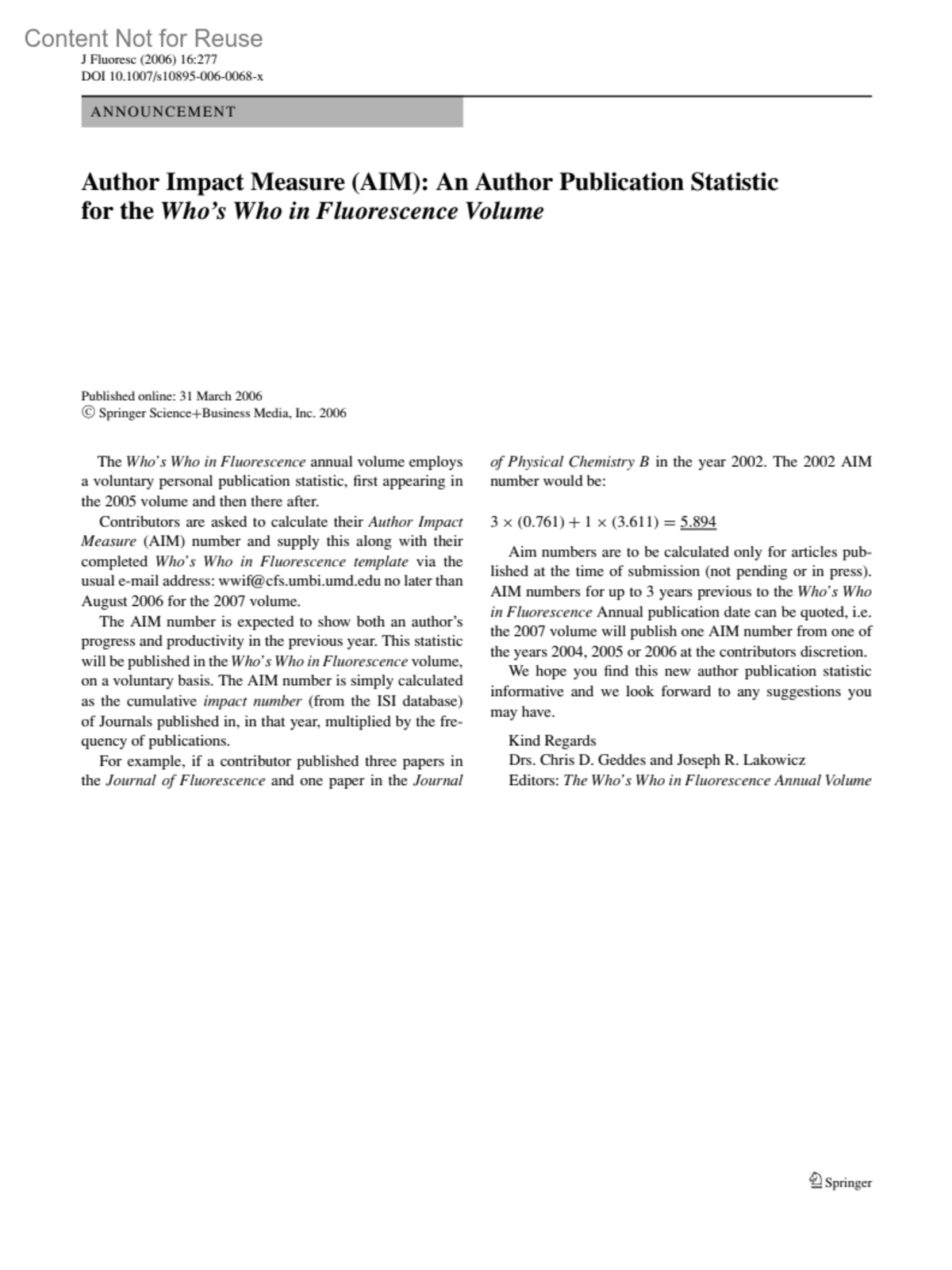 Author Impact Measure (AIM): An Author Publication Statistic for theWho's Who in Fluorescence Volume