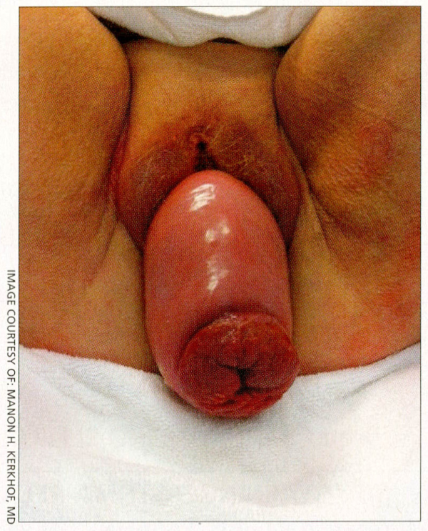 The patient's physical examination on admission was normal, but laboratory findings revealed severe renal failure with a creatinine level of 7.4 mg/dL (normal, 0.6-1.1 mg/dL), potassium level of 7.4 mmol/L (3.5-5 mmol/L), and a sodium level of 123 mmol/L (135-145 mmol/L). A renal ultrasound revealed severe bilateral hydronephrosis with hydroureteronephrosis caused by obstructive uropathy. A radiologist examined the patient and determined that she had a total uterine prolapse; the cervix was 11 cm outside of the vagina (FIGURE 1). Our patient's untreated pelvic organ prolapse (POP) had caused chronic renal failure. The patient was referred to a urogynecologist.