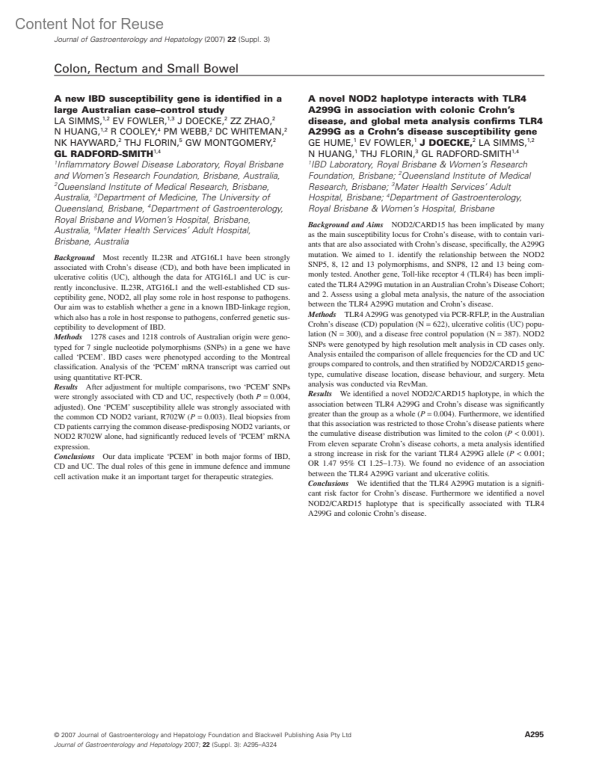 Journal of Gastroenterology & Hepatology 22:p A308, October 2007.