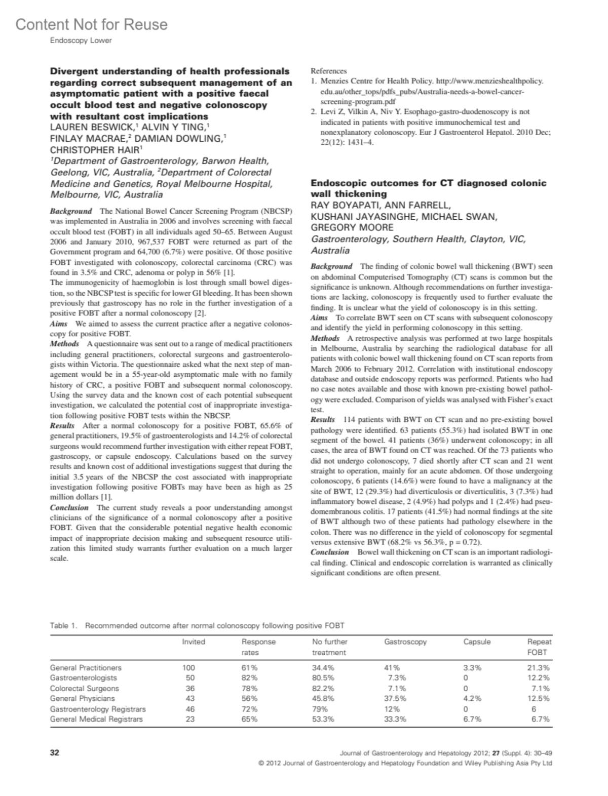 Journal of Gastroenterology & Hepatology 27:p 32, October 2012.