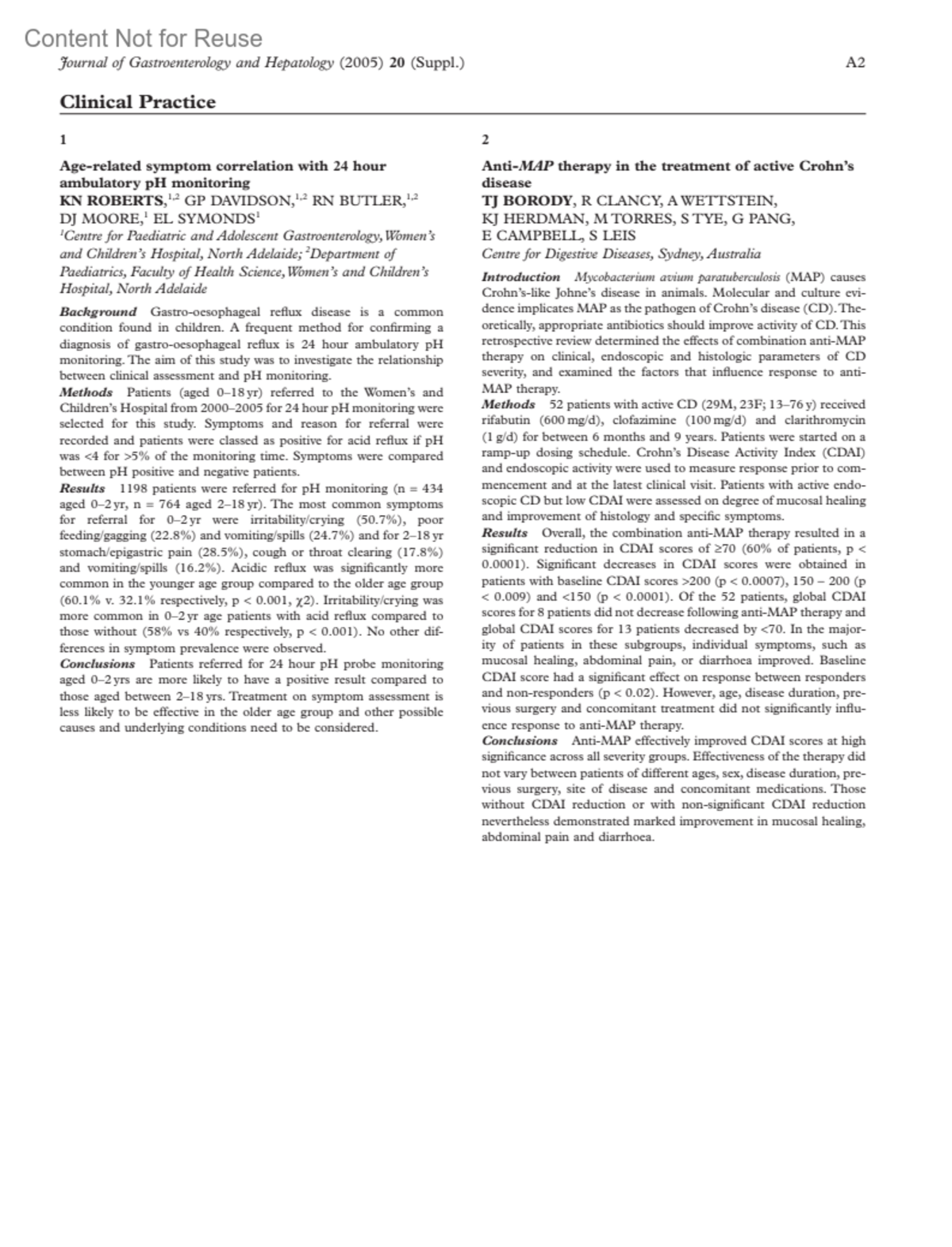 Journal of Gastroenterology & Hepatology 20:p A2, October 2005.