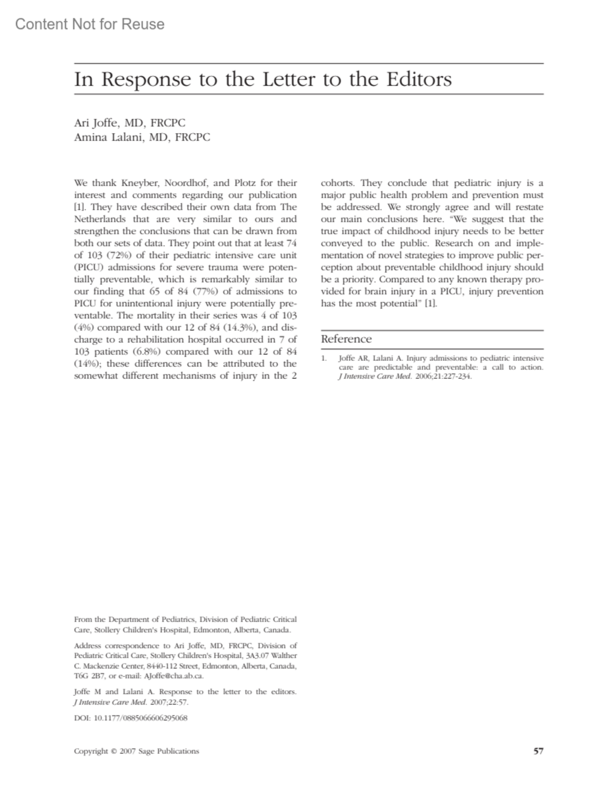 Address correspondence to Ari Joffe, MD, FRCPC, Division of Pediatric Critical Care, Stollery Children's Hospital, 3A3.07 Walther C. Mackenzie Center, 8440-112 Street, Edmonton, Alberta, Canada, T6G 2B7, or e-mail: [email protected].