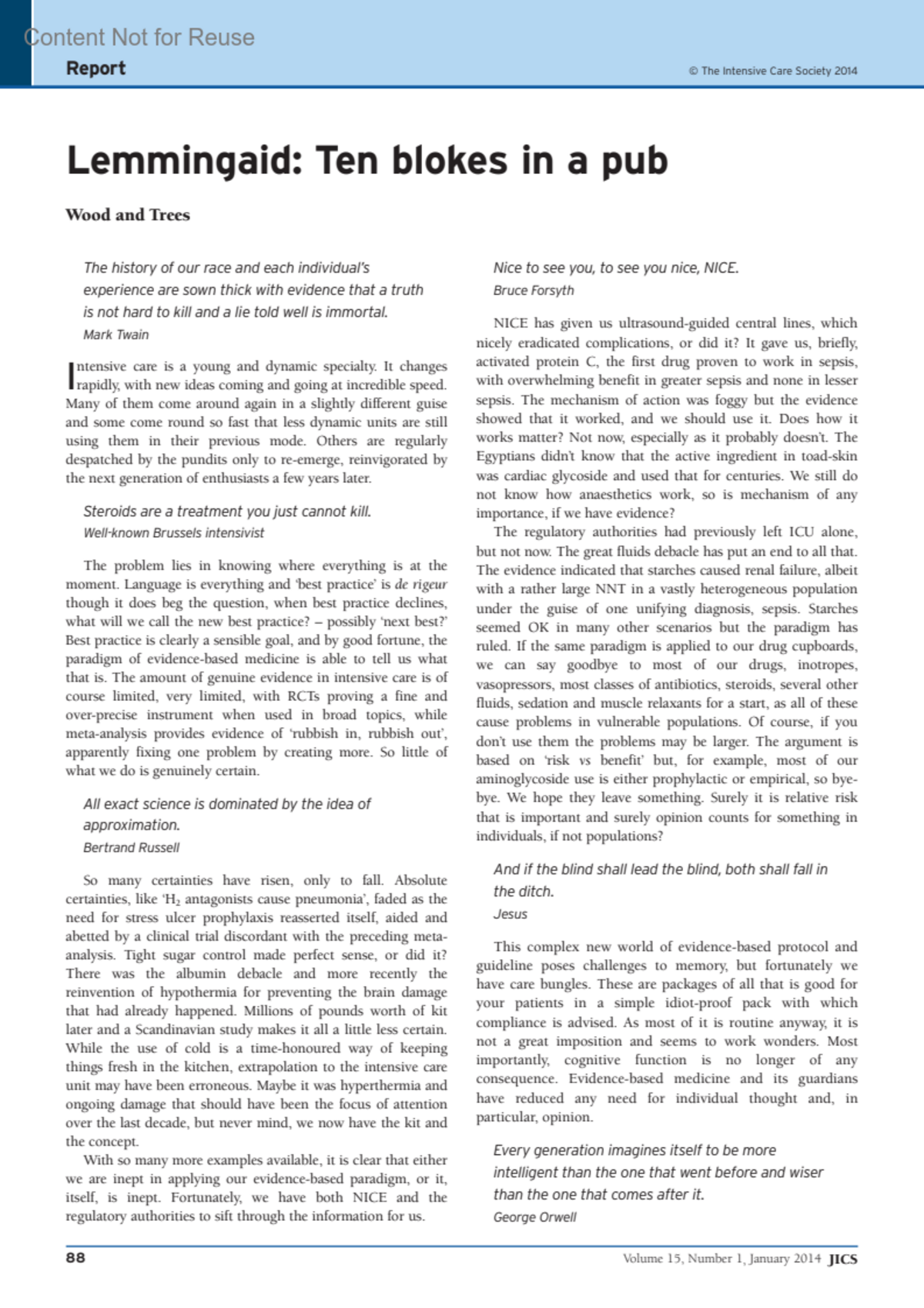 Lemmingaid Ten Blokes in a PubWood, Trees, Journal of the Intensive Care Society 15(1):p 88-89, January 2014. | DOI: 10.1177/175114371401500121Copyright © 2014 by SAGE Publications