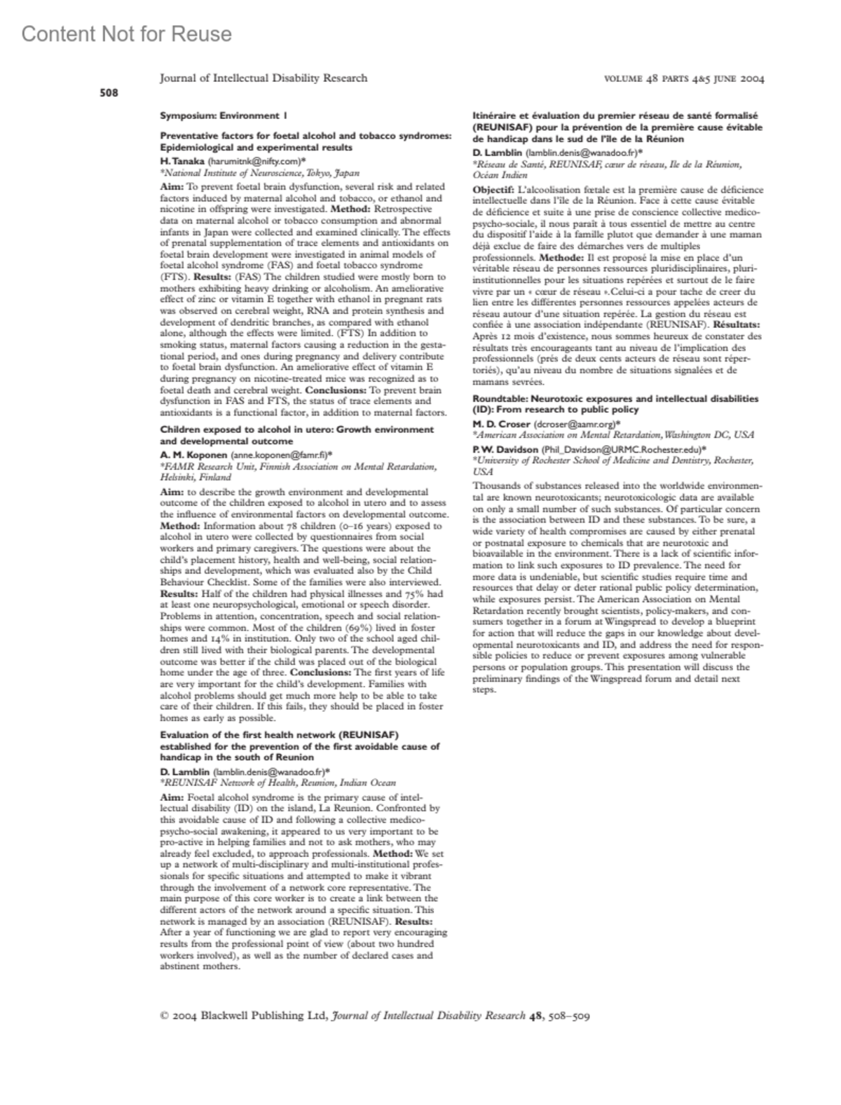 Preventative factors for foetal alcohol and tobacco syndromesEpidemiological and experimental resultsTanaka, H.Author information*National Institute of Neuroscience, Tokyo, Japan. [email protected]Journal of Intellectual Disability Research 48(5):p 508, June 2004.Copyright © 2004 Blackwell Publishing Ltd.