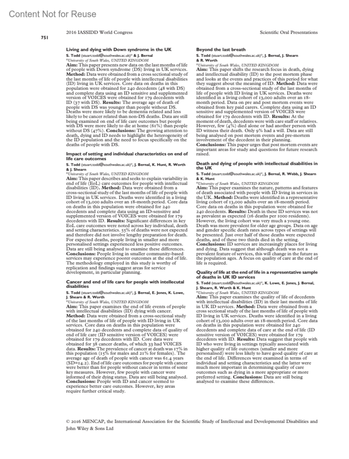 Beyond the last breathTodd, S.Bernal, J.Shearn, J.Worth, R.Author informationUniversity of South Wales, UNITED KINGDOM*([email protected])Journal of Intellectual Disability Research 60(8):p 751, July-August 2016.Copyright © 2016 John Wiley & Sons, Ltd