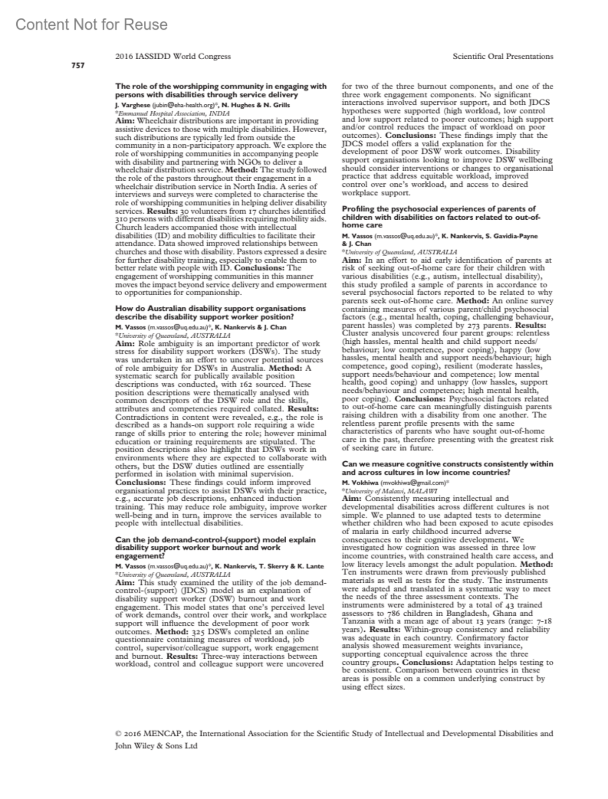 Can we measure cognitive constructs consistently within and across cultures in low income countries?Vokhiwa, M.Author informationUniversity of Malawi, MALAWI*([email protected])Journal of Intellectual Disability Research 60(8):p 757, July-August 2016.Copyright © 2016 John Wiley & Sons, Ltd