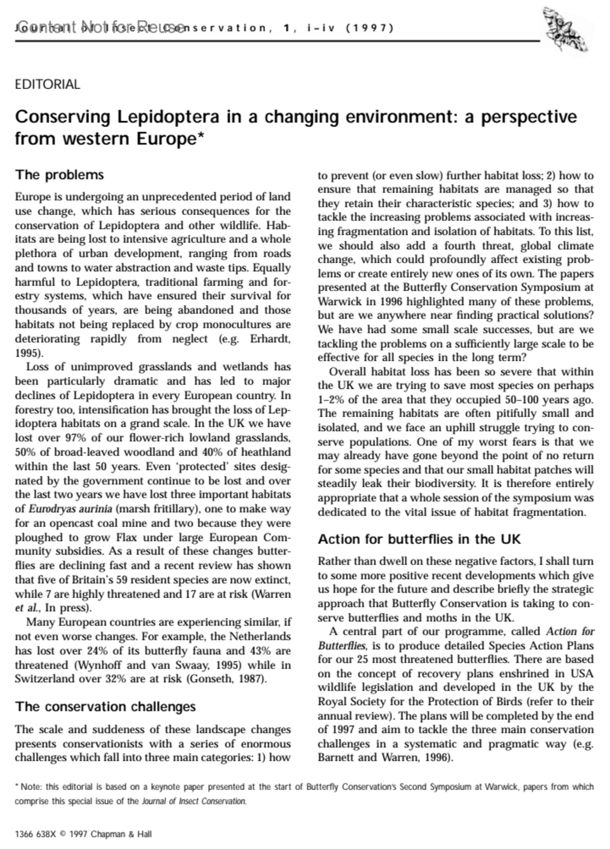 Journal of Insect Conservation 1(2):p 1-4, 1997.