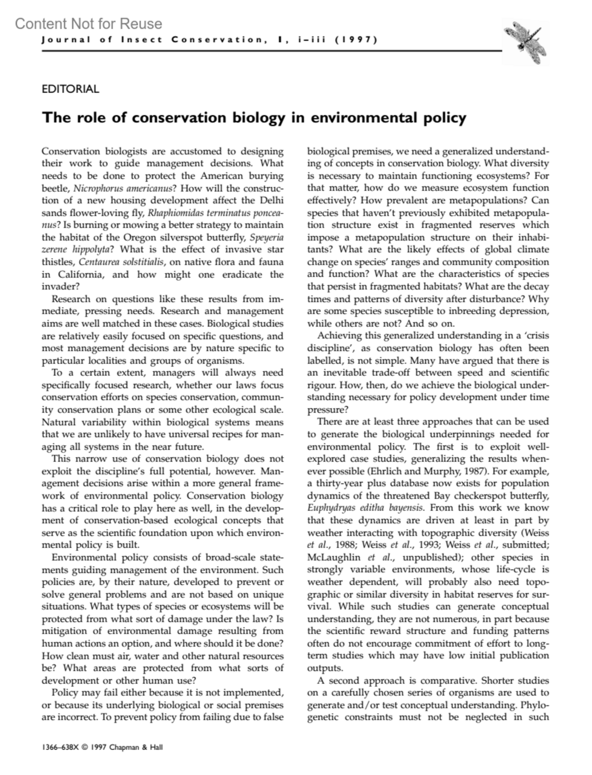 The role of conservation biology in environmental policyBoggs, Carol L.Journal of Insect Conservation 1(4):p 1-1, 1997.Copyright ©1997 Kluwer Academic Publishers