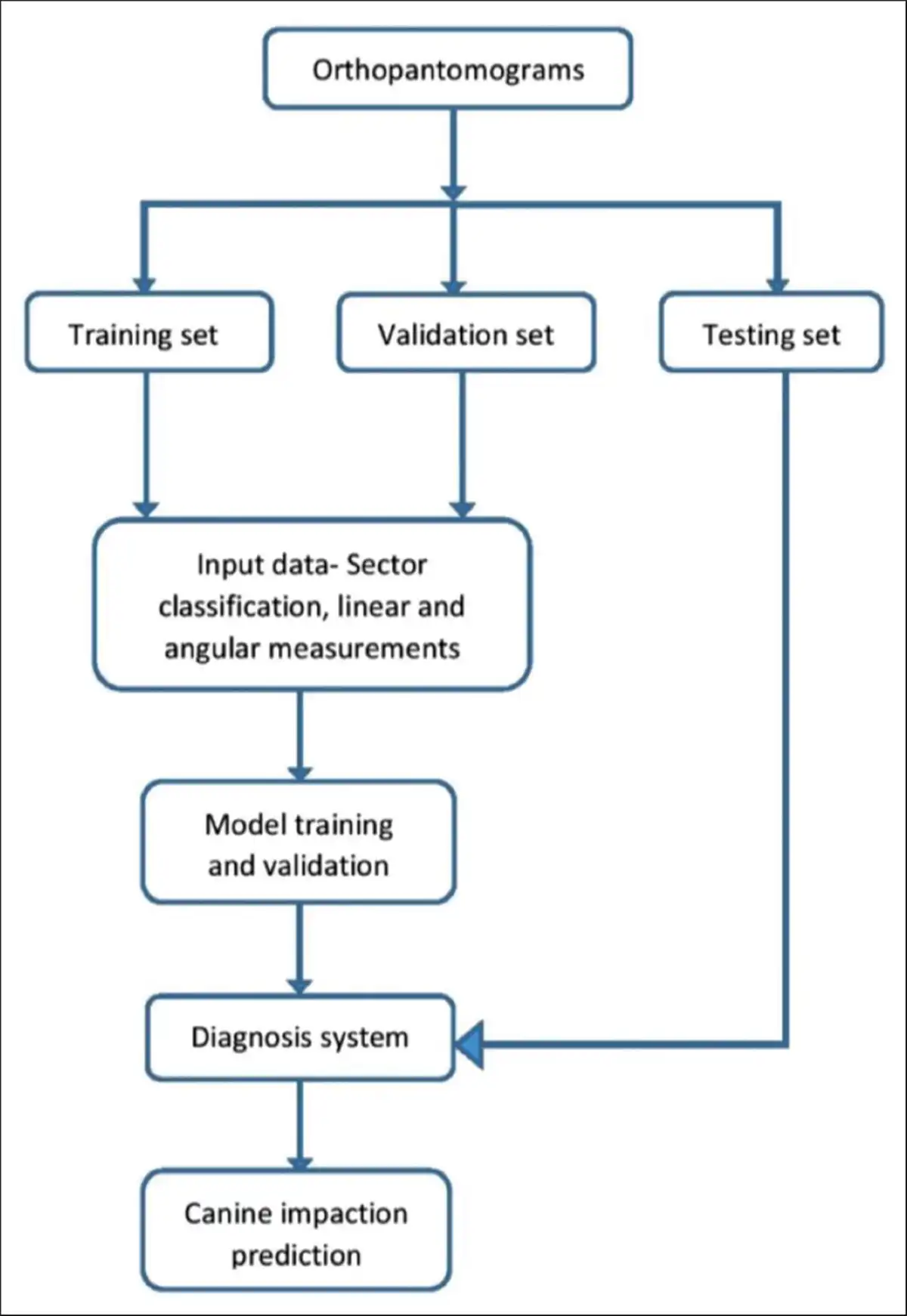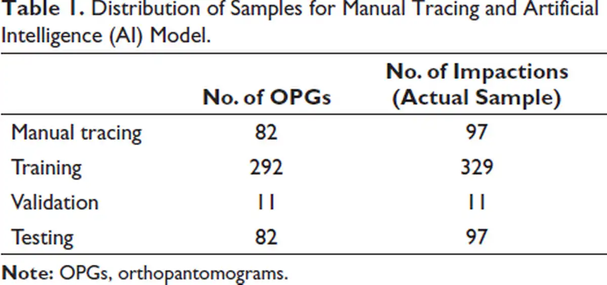 The input dataset for the AI model included OPG images of 437 maxillary canine impactions along with normative values for the sector classification and angular parameters. The images were distributed into: