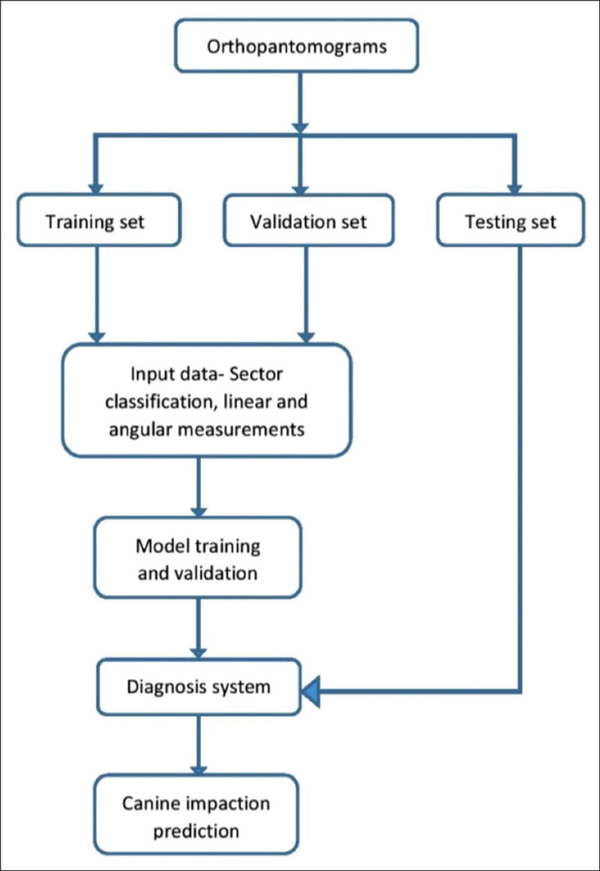 AI has been widely used in the medical field for image analysis. Commonly used models include artificial neural network (ANN),, CNN,, random forest, support vector machine, etc., The CNNs are the most commonly used AI model. This study used the CNN architecture to test the accuracy of AI model developed using OPGs to predict the favorability of maxillary canine impaction as compared to manual prediction.