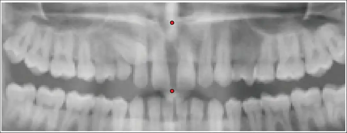 Step 7: A point was marked on the midline to measure the horizontal distance from the cusp tip of the impacted maxillary canine to the midline (Figure 9).