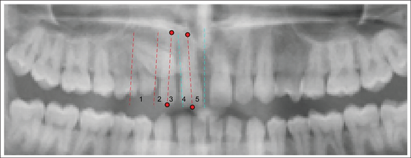 Step 3: Two points (root apex and the midpoint of the incisal edge of incisors) were marked to generate the long axes of central and lateral incisors (Figure 6).