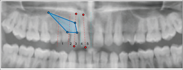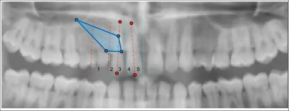 OPG images along with the normative values for the sector classification and angular parameters were given as an input for the AI model. The coordinates in the training process were as follows: