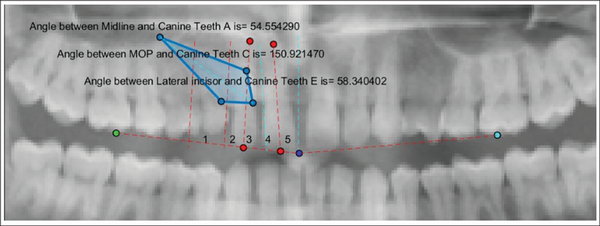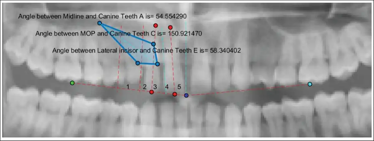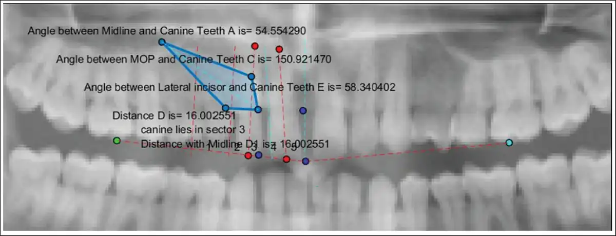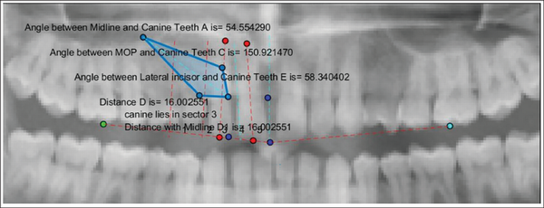 The system generated the output values as the angles made by the long axis of the impacted maxillary canine to the midline, occlusal plane, lateral incisor, and the linear distances from the canine cusp tip to occlusal plane and midline. The final layer showed the measurements of all the six parameters which were stored as a single image in PNG format (Figure 8). Based on the measurements, AI model automatically predicted the favorability of maxillary canine impaction, and the final measurements along with the prediction were reported in an Excel format.