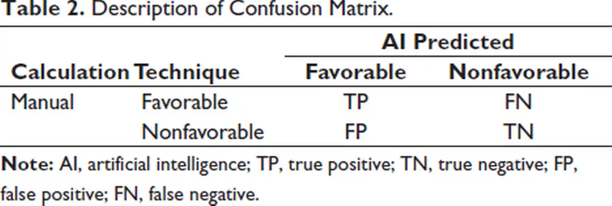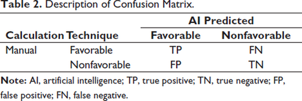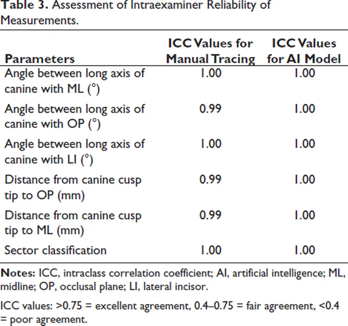 The following statistical analysis was carried out using Statistical Package for the Social Sciences (SPSS), version 16.0 (SPSS Inc., Chicago, IL). The intraexaminer reliability of linear and angular measurements was evaluated with the intraclass correlation coefficient (ICC). Mean and standard deviation were calculated for both manual and AI diagnostic results. To assess the performance of AI for the angular and sector parameters, diagnostic accuracy, sensitivity, specificity, and positive and negative predictive values were calculated by using the following formula through confusion matrices data (Table 2).
