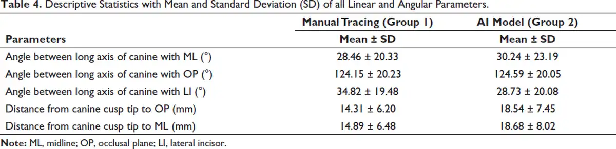 The decision-making for the impacted maxillary canine using the linear parameters could not be performed because of lack of normative values in the literature. In addition, linear parameters were used to predict the favorability based on the change in the magnitude of the canine cusp tip in OPGs taken at sequential intervals. Paired t-test was used to check the correlation of the linear parameters between AI model and manual tracing and it was found to be statistically significant indicating a weak correlation between the actual manual tracing and the AI prediction. This could be due to the magnification errors in OPGs that affect the linear measurements.