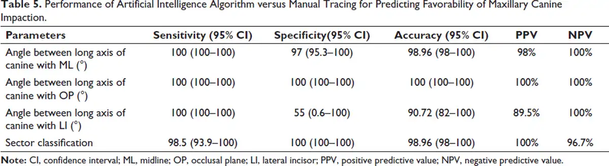 The proposed AI model had higher accuracy in predicting the favorability of eruption in maxillary canine impactions. The performance was excellent for sector classification, angle between long axis of canine with midline and occlusal plane, whereas it was slightly lower but acceptable for angle between long axis of the canine and lateral incisor. Due to lack of normative values, decision-making on favorability could not be performed with linear parameters.