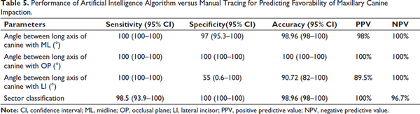 The angle between long axis of canine with the occlusal plane had an accuracy of 100%. The angle between long axis of canine with midline and sector classification had a similar accuracy score of 98.96 (98–100). The angle between long axis of canine with lateral incisor had the least accuracy values of 90.72% (82–100).