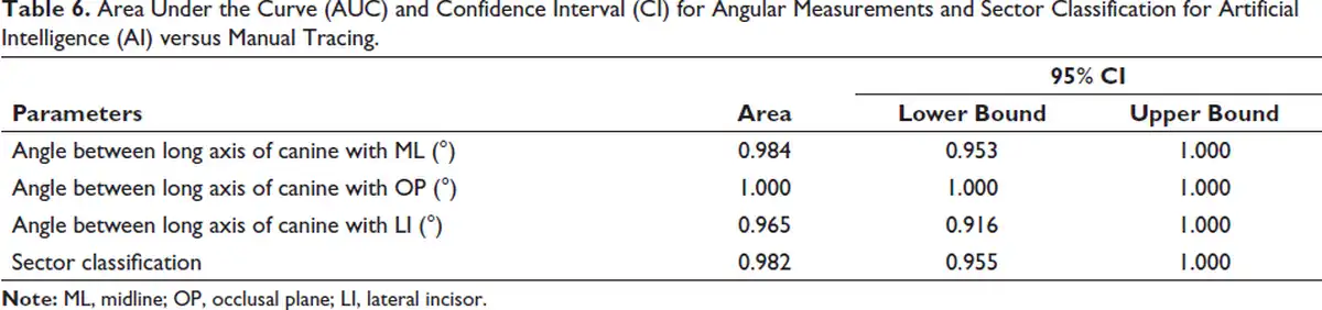 The results of the present study showed that the performance of the AI model when compared to manual tracing was excellent for all the parameters except for sector classification which had a sensitivity score of 98.5 (93.9–100) and negative predictive value of 96.7%. This is because one of the samples which was actually diagnosed as sector 2 (favorable) in manual tracing was diagnosed as sector 5 (not favorable) in the AI prediction.