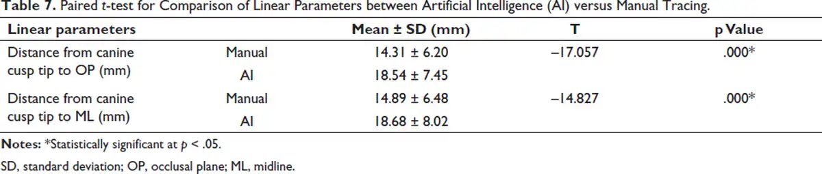 The t-test values showed a statistically significant difference for both distance from the canine cusp tip to occlusal plane and midline (p = .000) (Table 7).