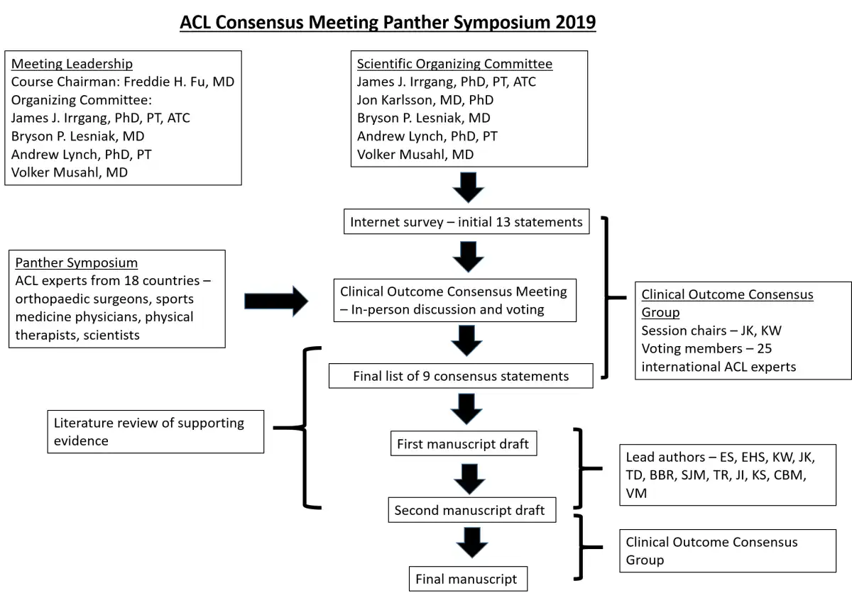 A multidisciplinary panel of national and international experts in ACL injury, including orthopaedic surgeons, physical medicine and rehabilitation physicians, physical therapists and scientists, were convened in a 1-year consensus-building effort, which culminated in the ACL Consensus Meeting Panther Symposium held at the University of Pittsburgh and University of Pittsburgh Medical Center in Pittsburgh, PA, USA, in June 2019. The symposium included delegates from 18 countries encompassing 6 continents. The working group of this topic consisted of 25 participants.
