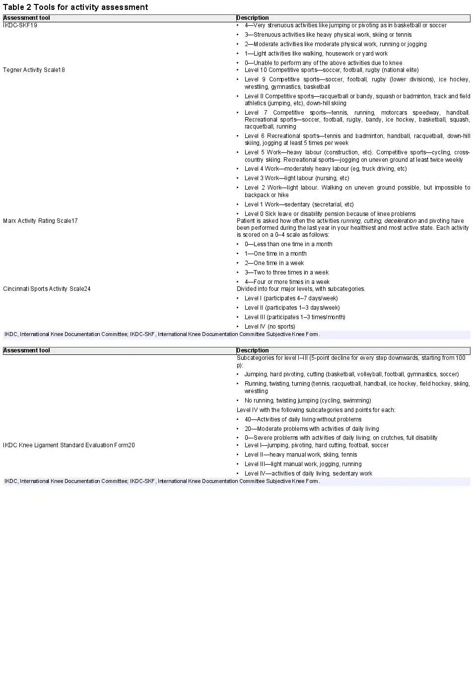 The demographic data should give an overview of the characteristics of the investigated population, which aids to determine the generalisability of the study results. Demographic data should at a minimum include patient sex, age, anthropometric data, relevant medical history and prior knee joint injuries. Family history of ACL injuries may also be relevant since a heritable component of ACL injuries appears to exist. Moreover, the type and level of pre-injury sport or activity should be reported to determine whether the treatment successfully returned the patients to their pre-injury activity level. The recommended tool for sport and activity assessment is the Marx activity scale, which has been validated and has high reliability. The Marx activity scale enables an evaluation of both the type of activity and the exposure time, which are both crucial aspects when reporting on activity. In this aspect, it differs from other measures of activity, for example, the Tegner activity scale which enables grading of activity level but does not account for activity exposure. Other validated tools for activity include, for example, the International Knee Documentation Committee Subjective Knee Form (IKDC-SKF) which includes one item (item 8) related to the activity level which the patient performs on a regular basis. The item is answered by choosing one out of five responses ranging from very strenuous activity to unable to perform light activities. Classification of activity and sports participation can also be rated according to Level I–IV activity, which was included in the original version of the IKDC Knee Ligament Standard Evaluation form and is still frequently used in ACL research. Another example of a tool for activity assessment is the Cincinnati sports activity scale. The tools for activity assessment are presented in table 2. It is of importance to further distinguish between pre-injury and pre-surgery activity level. Since a pre-surgery activity level has a risk of being representative of the patient’s activity while injured, pre-injury activity should always be reported.
