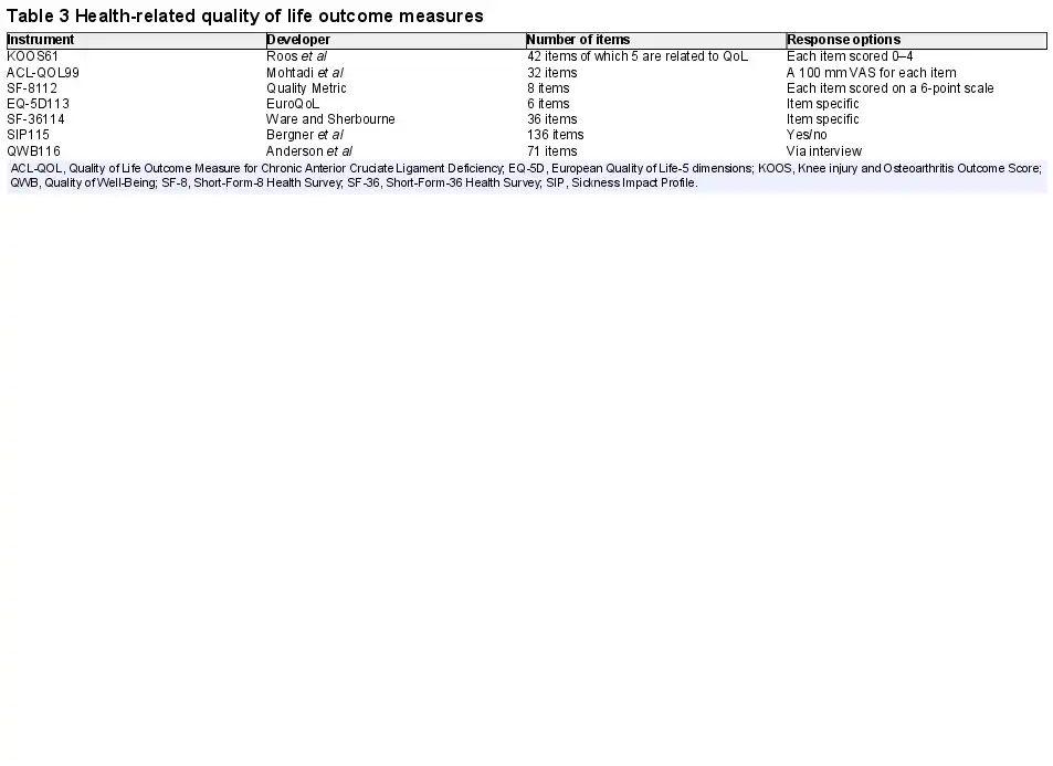 The impact of the ACL injury on the patient’s overall well-being and quality of life before treatment should also be measured. A Health-Related Quality of Life (HRQoL) measure covers a larger picture of how an ACL injury affects a patient in terms of physical, social and emotional health, which must not be overlooked among patients sustaining an ACL injury. Pre-treatment assessment of HRQoL allows for evaluation of health status over time and whether the treatment restores the patient to better, similar or worse health. Most measures of HRQoL also have the advantage of providing the possibility to determine utilities that are used in estimating the economic impact of the injury and allow for comparison between many other conditions and treatments. A list of HRQoL measures is provided in table 3.