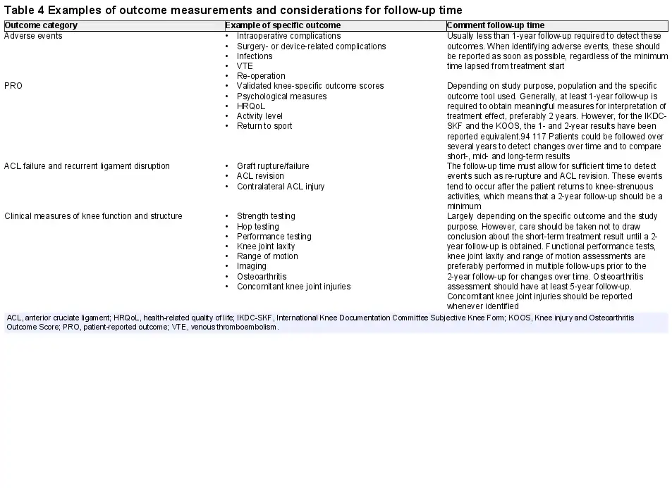 The follow-up time of a study should be defined depending on what is relevant in relation to the primary investigated outcome. In general, outcomes after ACL treatment can be divided into four categories—early adverse events, PROs, ACL failure/recurrent ligament disruption and clinical measures of knee function and structure (box 2), all of which could be further stratified in specific outcomes necessitating different considerations for follow-up time as exemplified in table 4.
