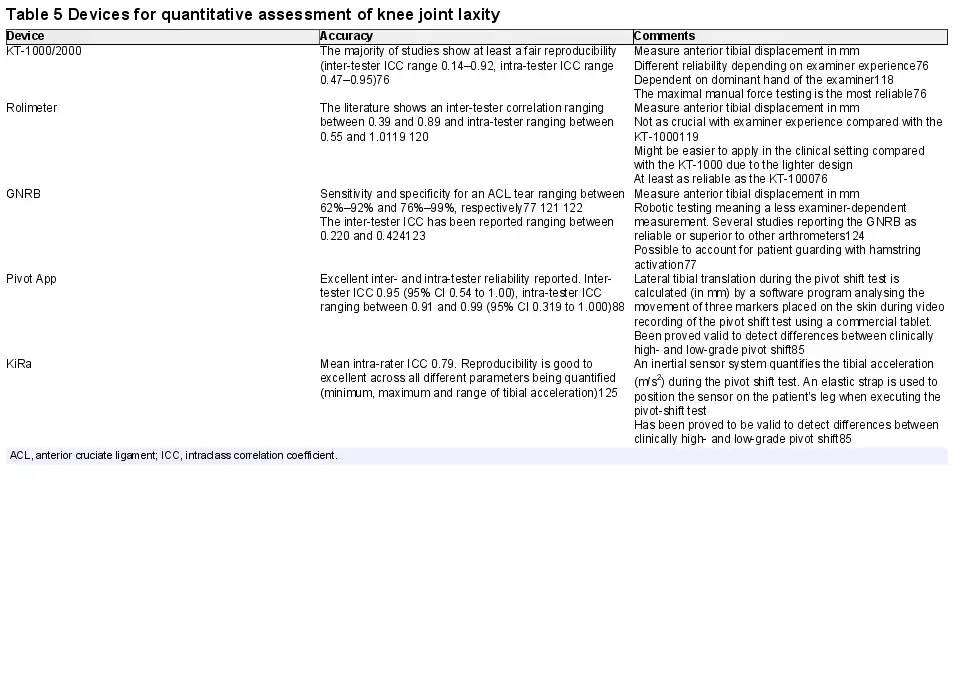 Evaluation of knee joint laxity is a cornerstone for evaluating the outcome of ACL treatment. Quantitative measures of knee joint laxity increase the reliability and validity.