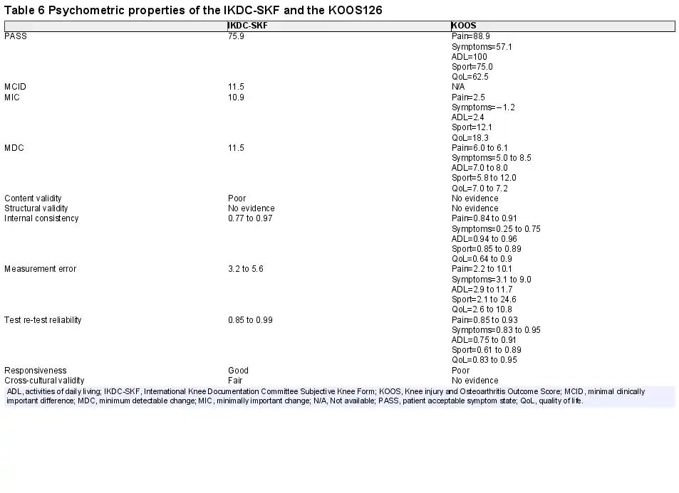 The evaluation of treatment outcome started historically with use of objective measurements as proxies for what clinicians and patient really cared about. For instance, both rating scales and measures of ROM, strength and laxity were frequently used; however, these measures are limited by inter-rater and intra-rater variability and alone failed to determine symptoms and limitations perceived important by the patient. Failure to report and quantify the patients’ perspective of treatment outcome after ACL injury led to the development of knee-related PROs during the late 1990s and early 2000s. The two most commonly used PROs after ACL injury are the KOOS and the IKDC-SKF, which were both developed during this time period. Measurement properties of the IKDC-SKF and KOOS are presented in table 6.