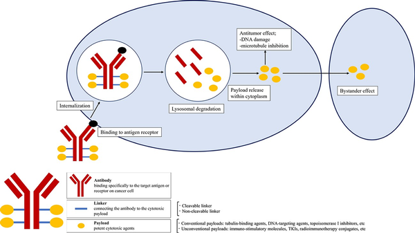 Structure of antibody-drug conjugates (ADCs). ADCs have three components: a monoclonal antibody that binds to an antigen or receptor on cancer cells, a linker that connects the antibody and payload, and a payload that is a potent cytotoxic agent. ADCs bind to target antigens on the surface of cancer cell followed by internalisation. After lysosomal degradation, payloads are released into the cytoplasm and induces cell death via DNA damage or microtubule inhibition. Moreover, payloads pass through the cell membrane and show antitumor effect on surrounding cancer cells, called bystander effect.