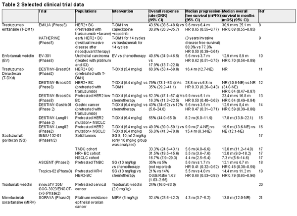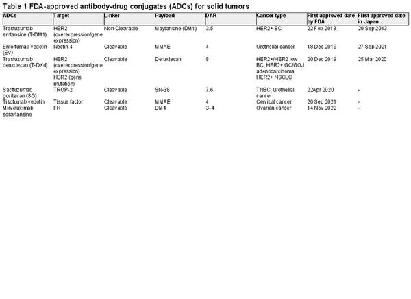 In summary, we have reviewed the structure and mechanism of ADCs, clinical data of approved ADCs for solid tumors. Based on the ability to deliver novel payloads selectively to targeting cancer cells, they have enabled more effective treatment with fewer side effects. Some ADCs show efficacy in multiple types of solid tumors, which suggests that ADCs may enable cancer treatment based on not only tumor types but also cell surface biomarkers. Further development on ADCs will bring new strategies for cancer treatment.