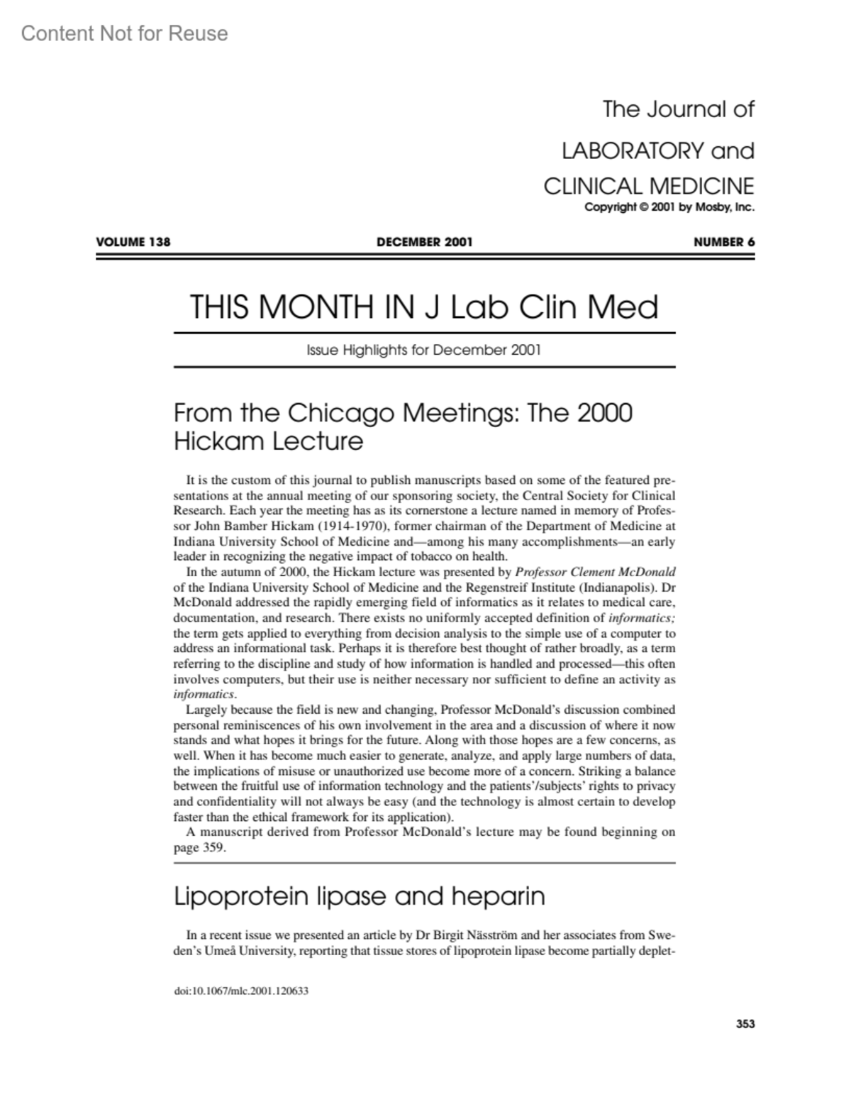 This month in J Lab Clin MedIssue highlights for December 2001Hammerschmidt, Dale E. MD, Editor-in-ChiefJournal of Laboratory & Clinical Medicine 138(6):p 353-355, December 2001.Copyright © Mosby-Year Book Inc. 2001. All Rights Reserved.