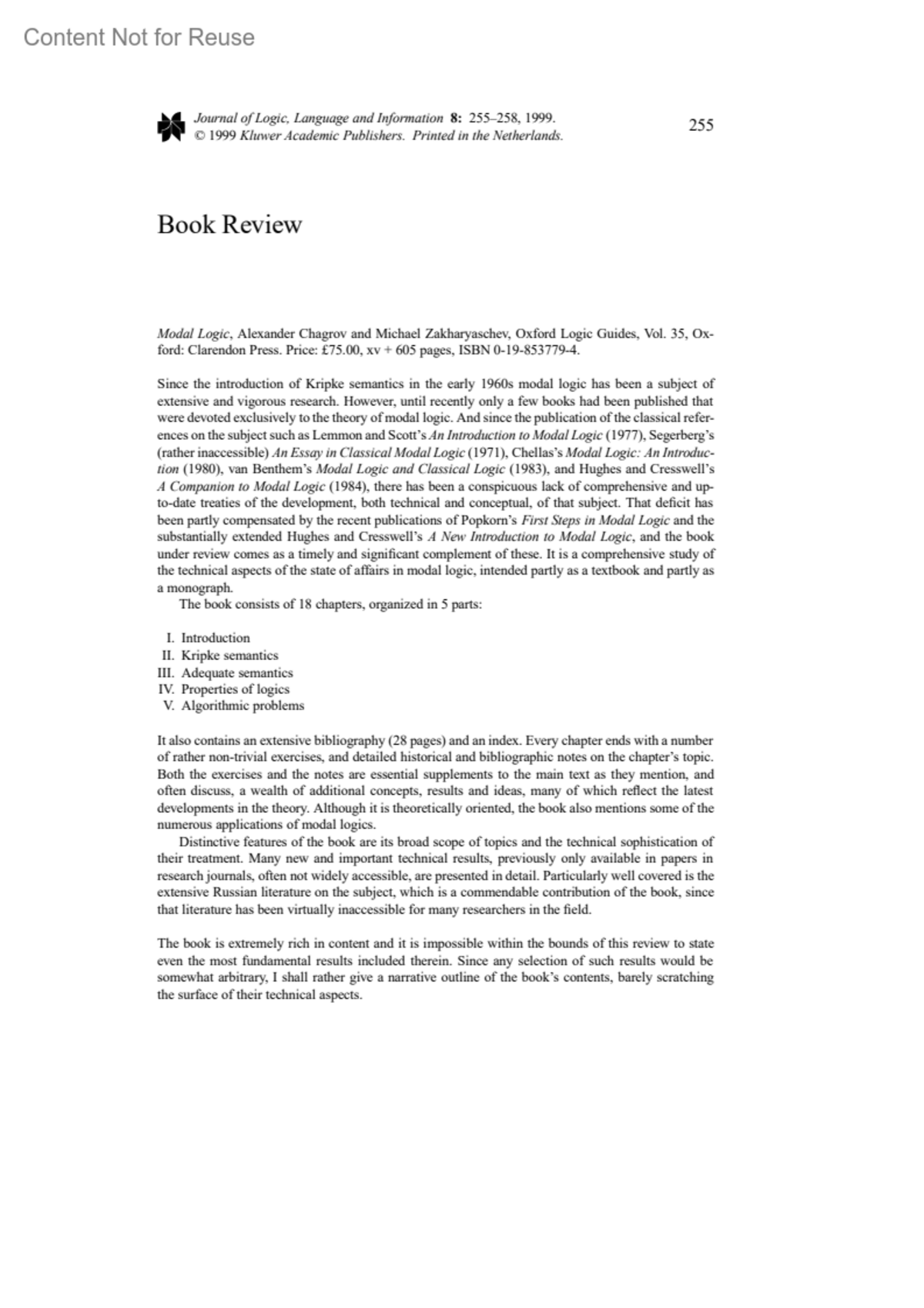 Modal Logic,Oxford Logic Guides, Vol. 35, OxfordClarendon Press. Price: £75.00, xv + 605 pages, ISBN 0-19-853779-4.Goranko, ValentinAuthor informationDepartment of Mathematics, Rand Afrikaans University, P.O. Box 524, Auckland Park 2006, Johannesburg, South Africa; E-mail: [email protected]Journal of Logic, Language and Information 8(2):p 255-258, April 1999.Copyright ©1999 Kluwer Academic Publishers