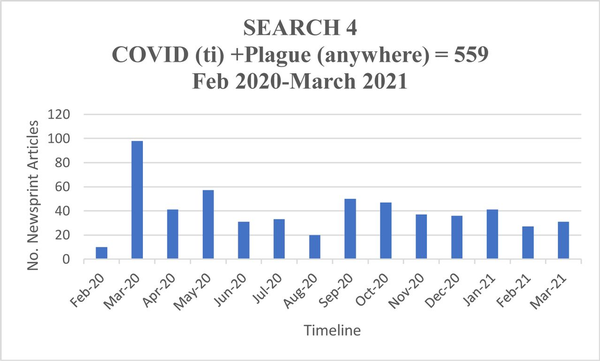 Incidence of ‘Covid’ in headline and ‘plague’ elsewhere in text, March 2020 to February 2021.
