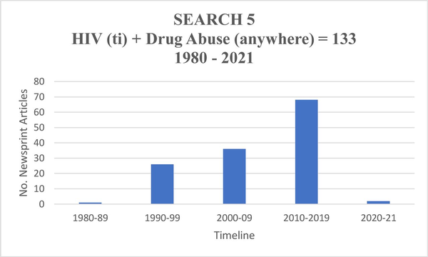 Incidence of ‘HIV’ in headline and ‘drug abuse’ elsewhere in text, 1980–2021.
