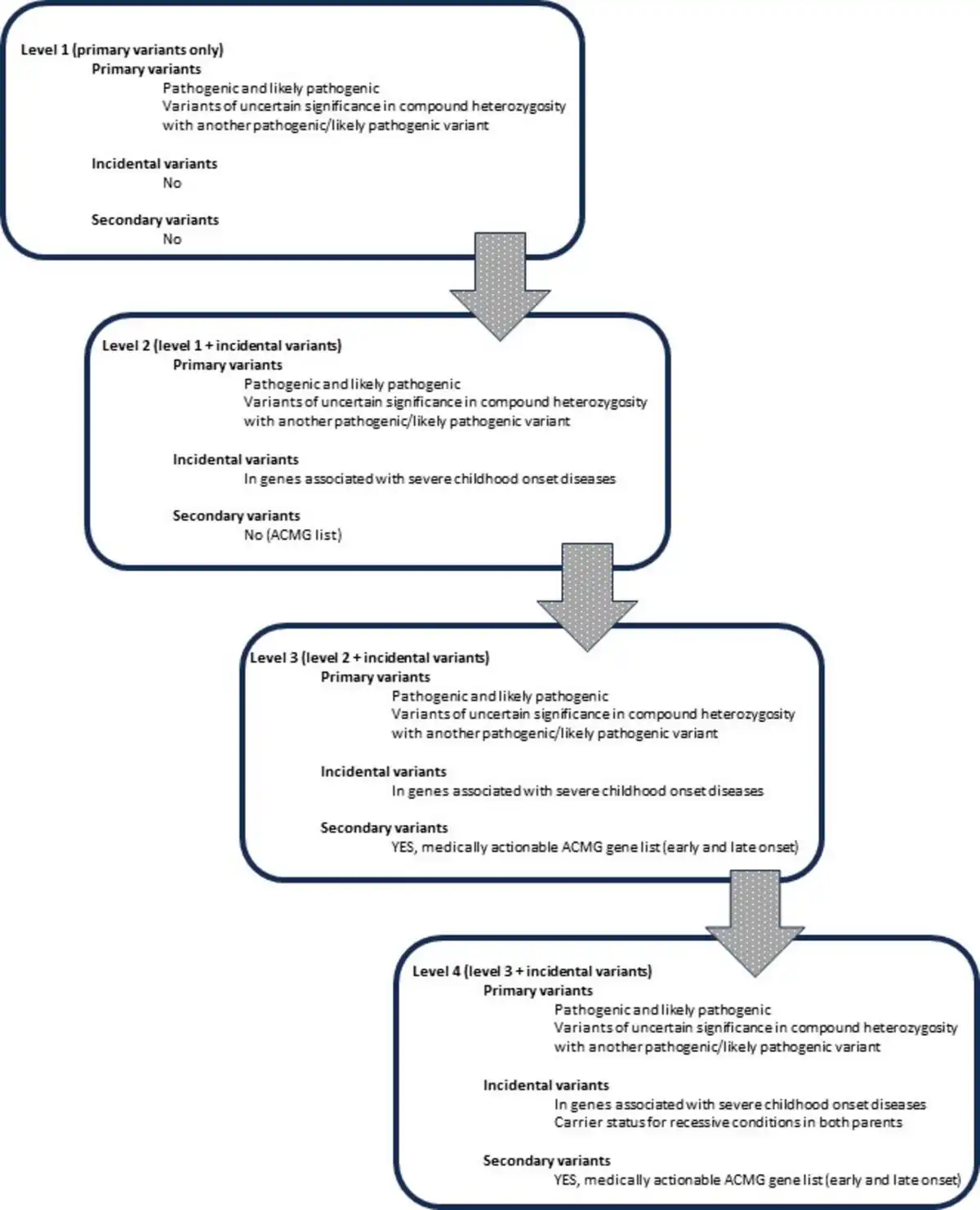 We suggest four distinct levels to consider when reporting exome findings (figure 1). Each centre should determine which level to assume, and it should be clearly stated in the informed consent form. Although the four levels are suggestive of being used, based on the literature review and preceding information, the authors suggest level 2 as the best option regarding clinical and ethical issues to be used in prenatal diagnosis.
