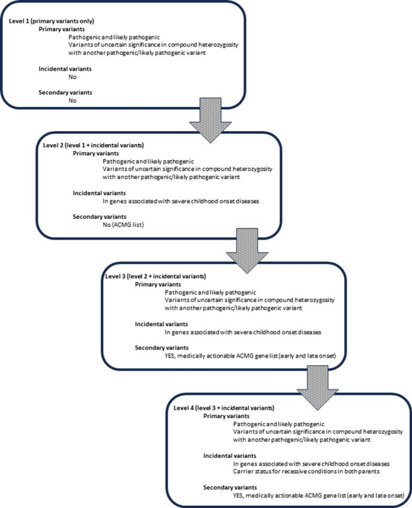 Proposed levels regarding the type of findings to be reported in the prenatal setting after a whole-exome sequencing study. ACMG, American College of Medical Genetics.
