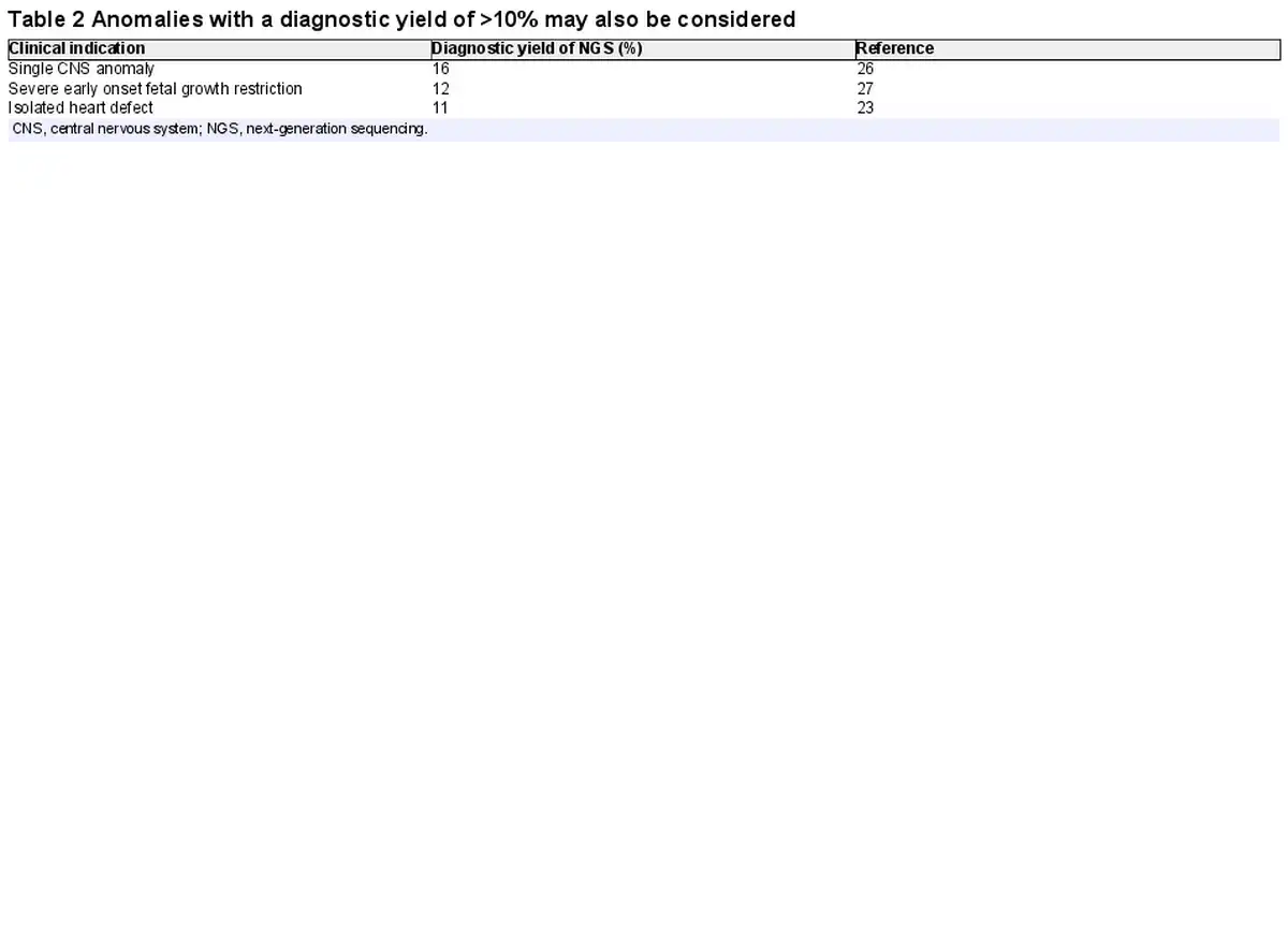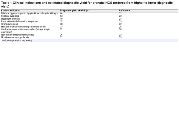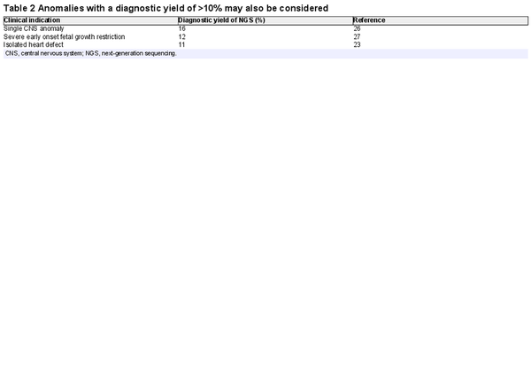NGS diagnostic tests are recommended when single or multiple structural abnormalities with a suggestive pattern of monogenic origin are detected by US (a 20% expected yield is the usually applied threshold not formally recognised). Some of these specific indications are summarised in table 1. Anomalies with a diagnostic yield of >10% may also be considered soon (table 2). NGS diagnostic tests are mostly applied in cases where no genetic alterations have been identified after QF-PCR and CMA. Occasionally, if there is a specific diagnostic approach in which SNVs are more prevalent than CNVs, some authors suggest performing a first-tier NGS analysis, without the need for CMA, on a case-by-case basis. NGS diagnostic tests may also be used as first-tier genetic tests to assess fetal phenotypes highly suggestive of monogenic anomalies not listed in table 1.