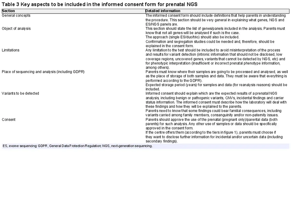These were the committee’s general objectives: (1) to briefly explain the technical approaches of prenatal NGS diagnostic tests, describing their strengths and limitations, (2) to reach a consensus on which fetal findings should be evaluated for analysis by NGS diagnostic tests and which variants should be reported and (3) to highlight the minimal aspects to be included for informed consent and counselling for families within our country.