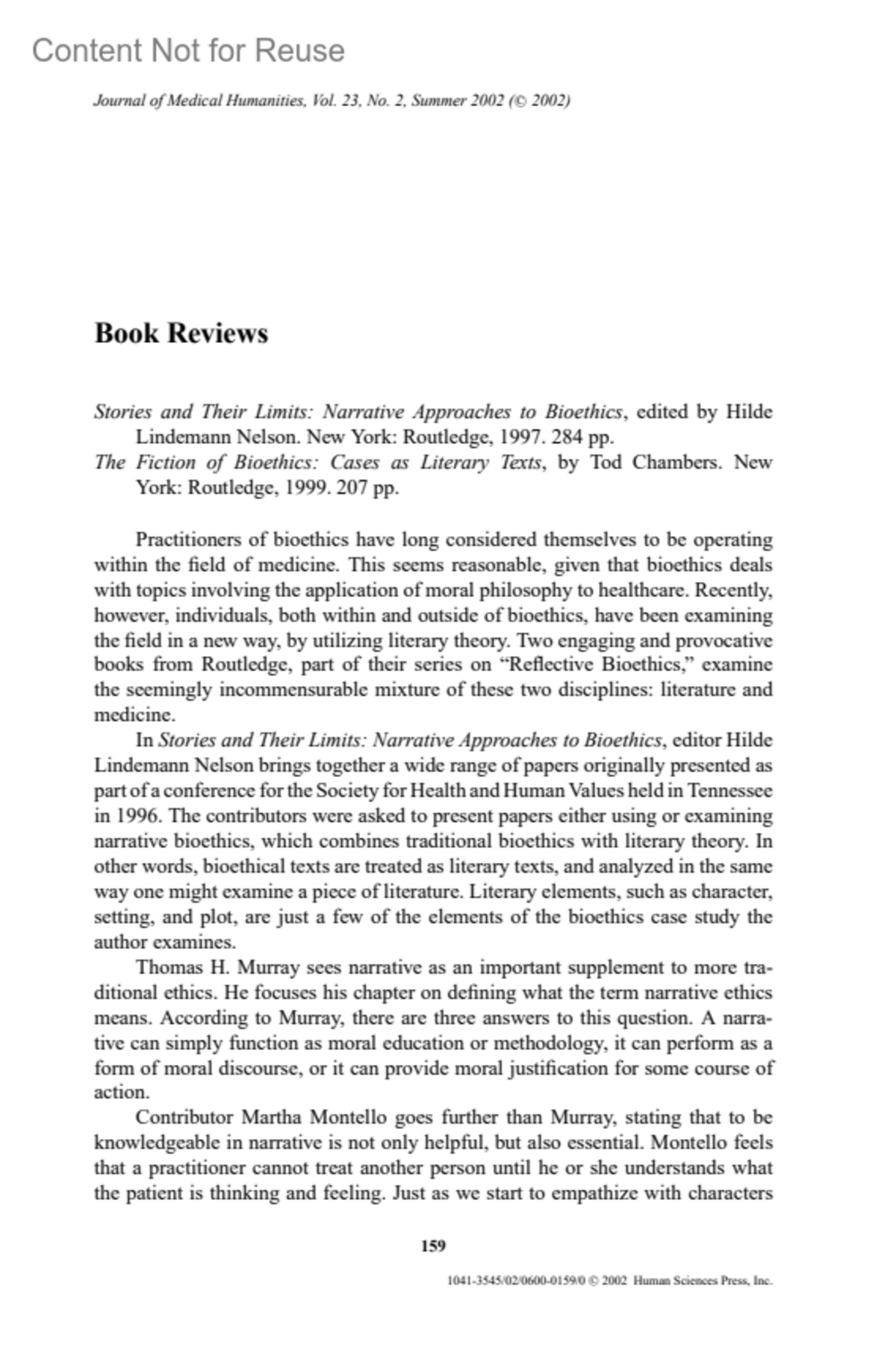 Stories and Their LimitsNarrative Approaches to Bioethics, edited by Hilde Lindemann Nelson. New York: Routledge, 1997. 284 pp.Klein, Michael J.Author informationVirginia Polytechnic and State UniversityJournal of Medical Humanities 23(2):p 159-161, 2002.Copyright ©2002 Kluwer Academic Publishers