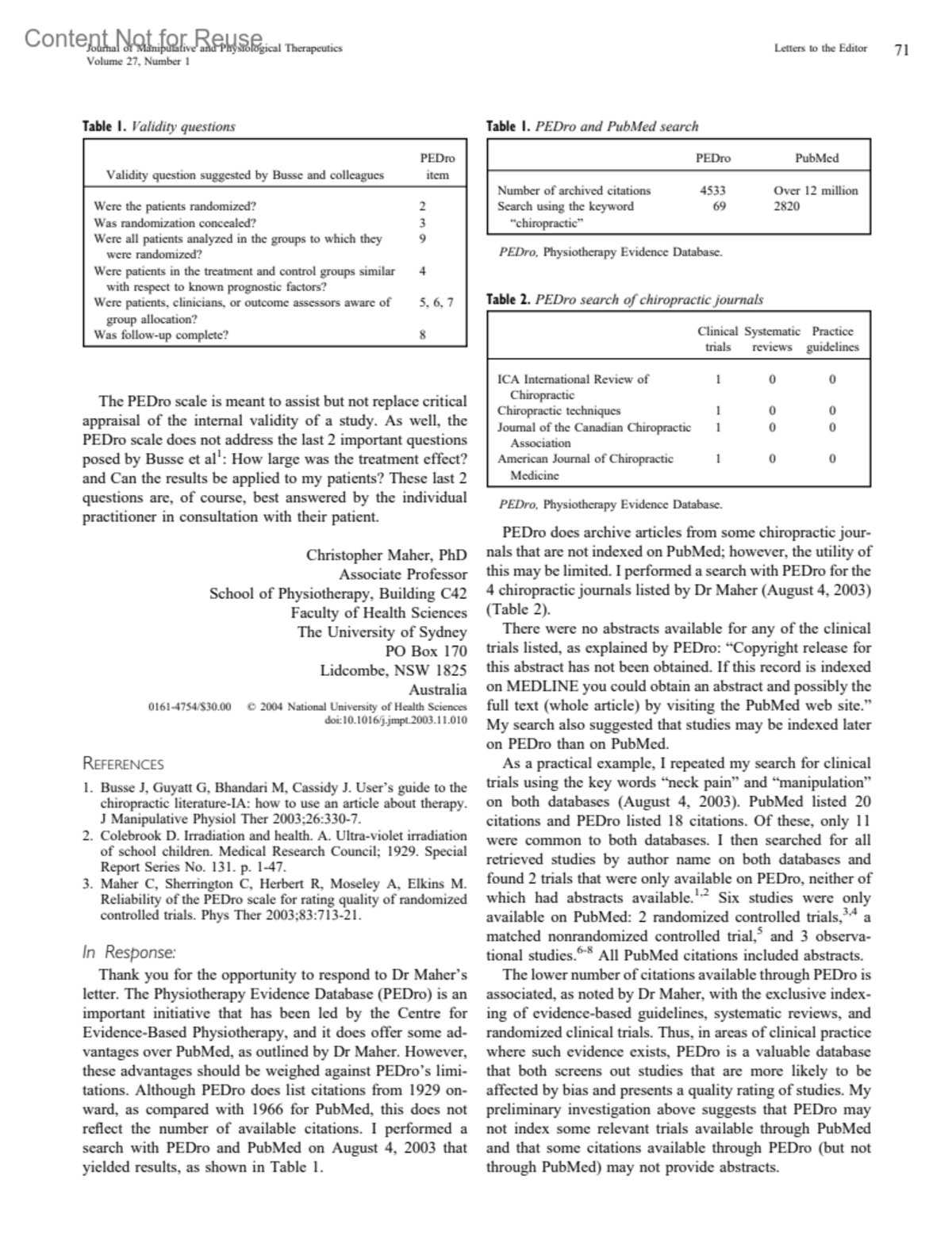 Journal of Manipulative and Physiological Therapeutics 27(1):p 71-72, January 2004.