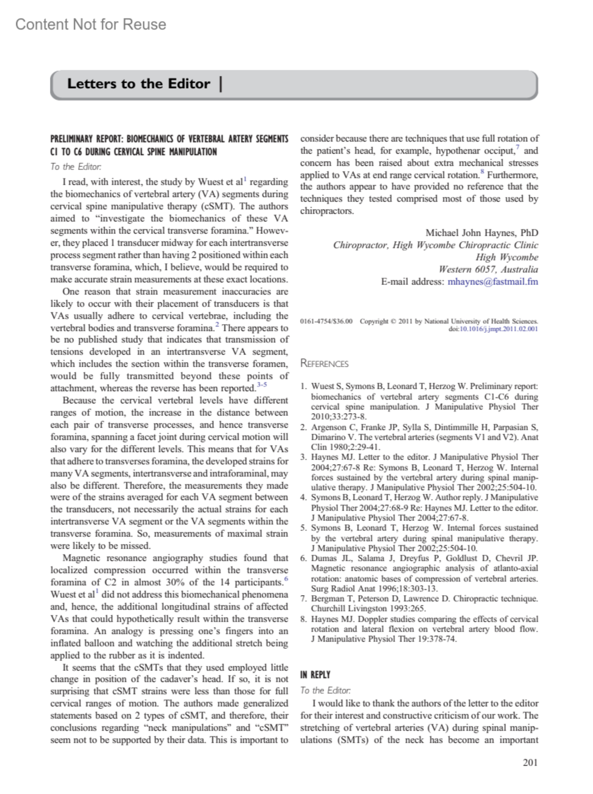 PRELIMINARY REPORTBIOMECHANICS OF VERTEBRAL ARTERY SEGMENTS C1 TO C6 DURING CERVICAL SPINE MANIPULATIONHerzog, Walter PhDAuthor informationProfessor, University of Calgary, Faculty of KinesiologyE-mail address: [email protected]Paper submitted January 19, 2011.Journal of Manipulative and Physiological Therapeutics 34(3):p 201-202, March-April 2011.Copyright ©2011 Elsevier, Inc.
