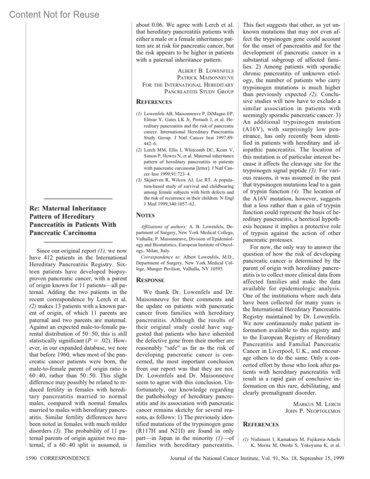 Re: Maternal Inheritance Pattern of Hereditary Pancreatitis in Patients With Pancreatic Carcinoma