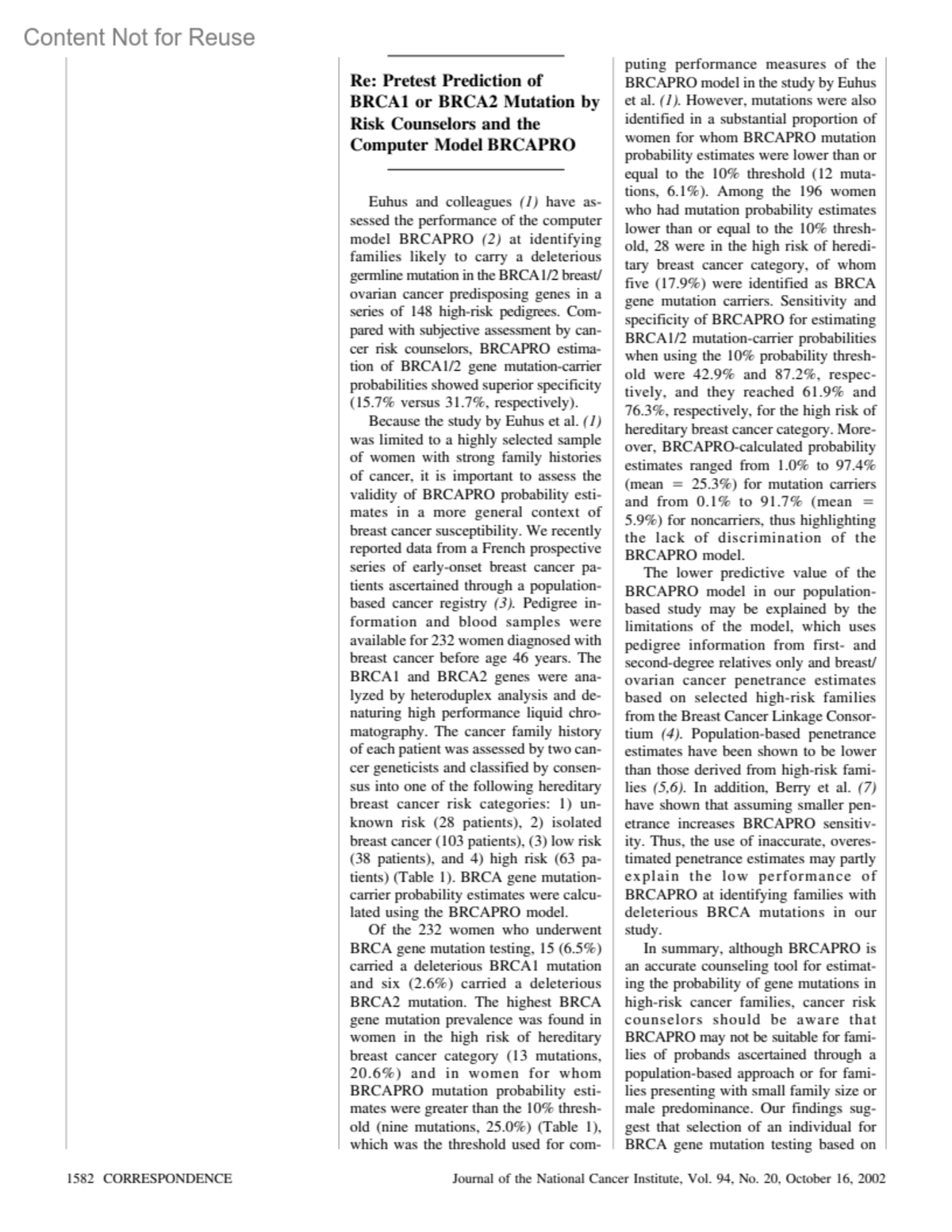 Re: Pretest Prediction of BRCA1 or BRCA2 Mutation by Risk Counselors and the Computer Model BRCAPRO