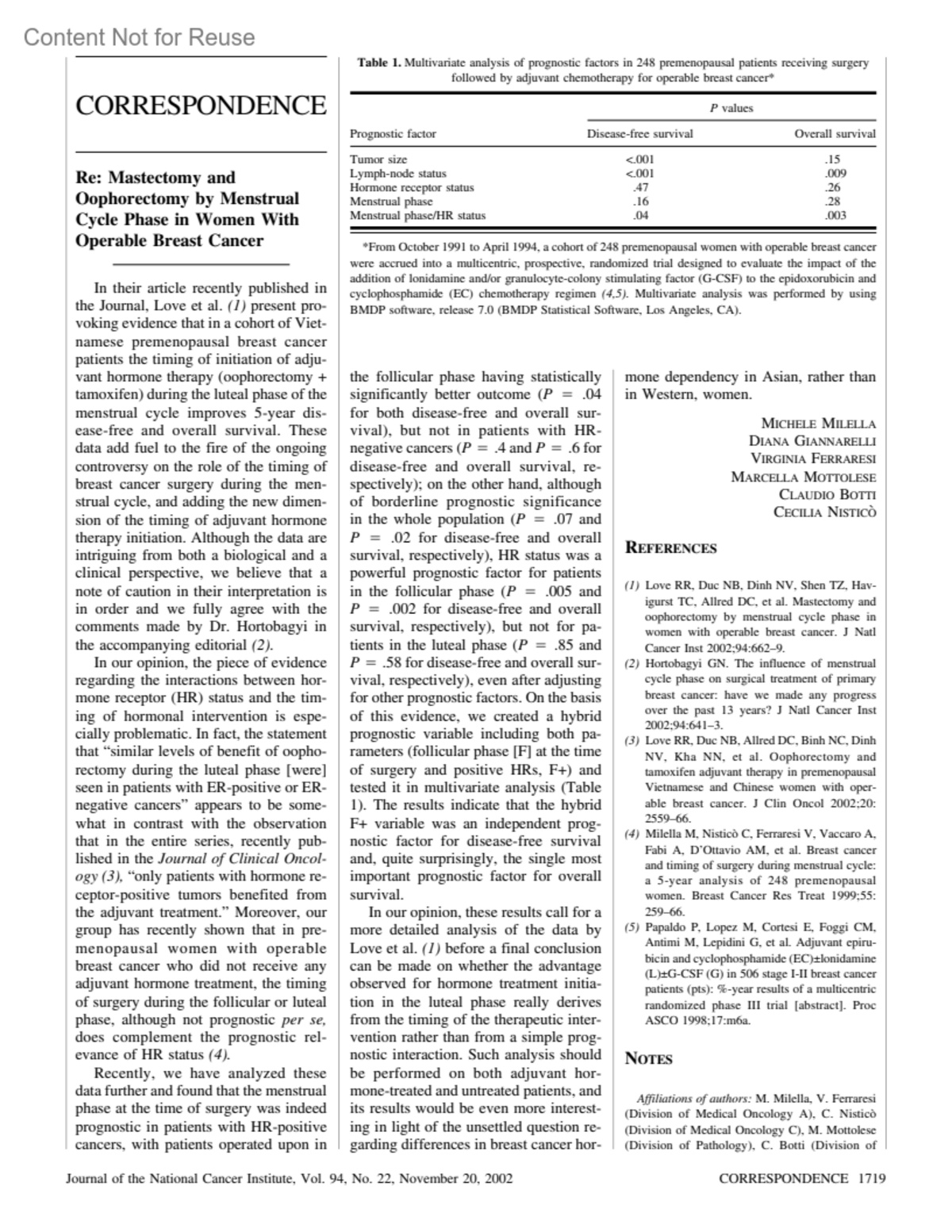 Re: Mastectomy and Oophorectomy by Menstrual Cycle Phase in Women With Operable Breast Cancer