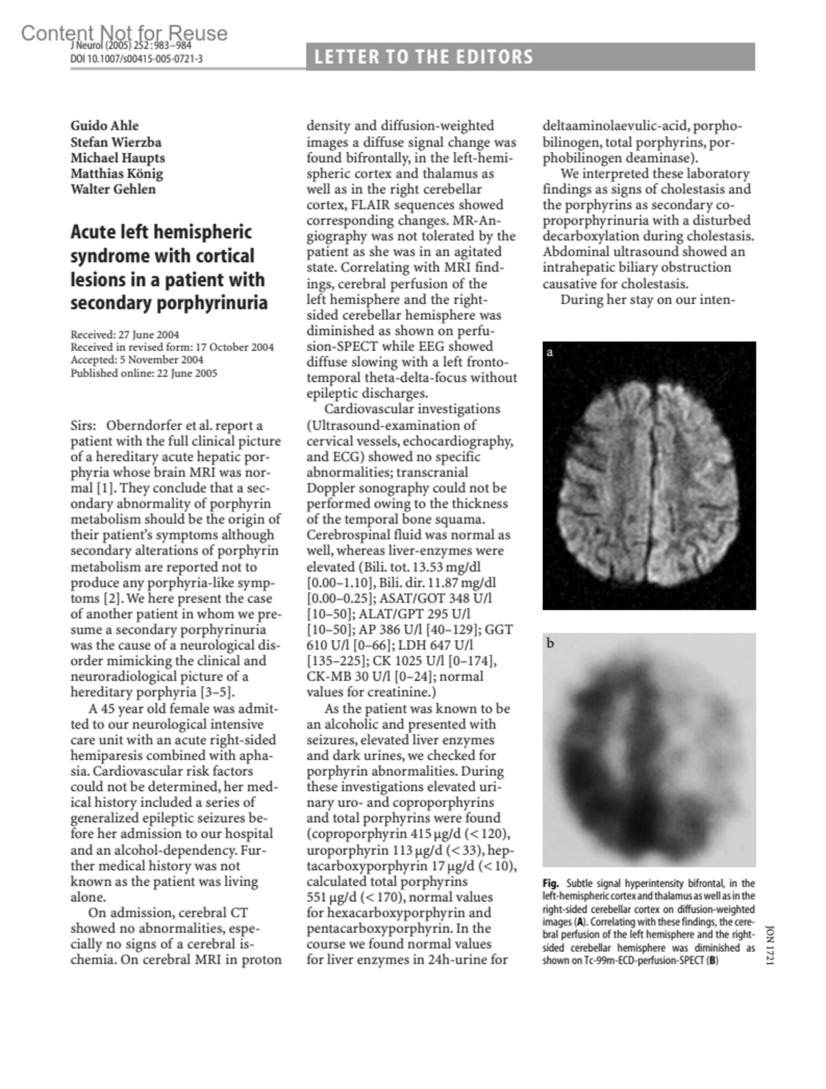 Acute left hemispheric syndrome with cortical lesions in a patient with secondary porphyrinuria