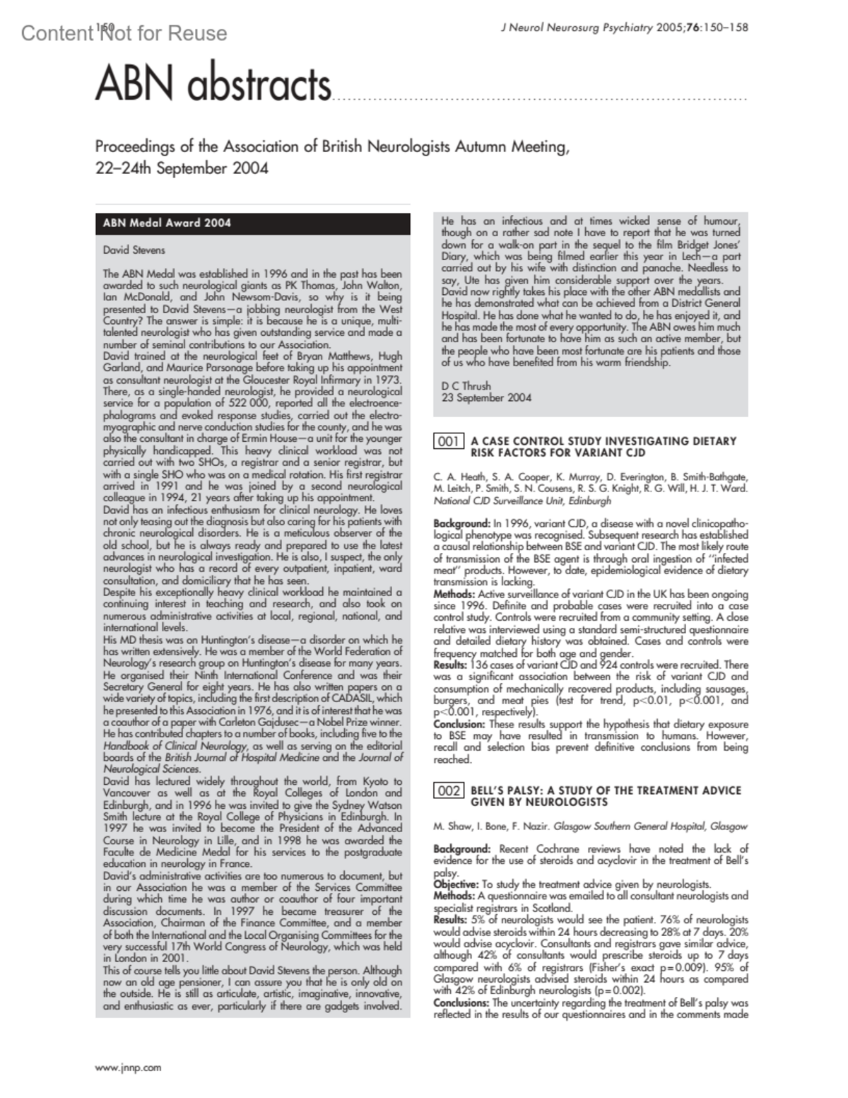 Journal of Neurology, Neurosurgery, & Psychiatry 76(1):p 157, January 2005.