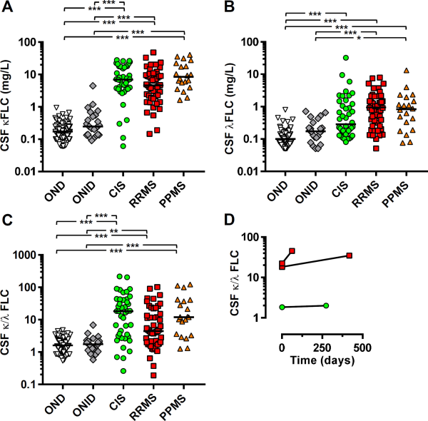 Highly elevated cerebrospinal fluid (CSF) free light chains (FLC) κ:λ ratios are detectable in multiple sclerosis (MS). The concentrations of (A) κ and (B) λ FLC and (C) the ratio were determined for CSF from clinically isolated syndrome (CIS), relapsing-remitting MS (RRMS), primary-progressive MS (PPMS), other neurological diseases (OND) and other neurological inflammatory diseases (ONID). (D) Repeat CSF samples at the indicated time interval were also analysed where available for one CIS (green circle) and two RRMS (red squares). Kruskal-Wallis with Dunn’s post-test; *p<0.05; **p<0.01; ***p<0.001, all other comparisons non-significant (p>0.05).